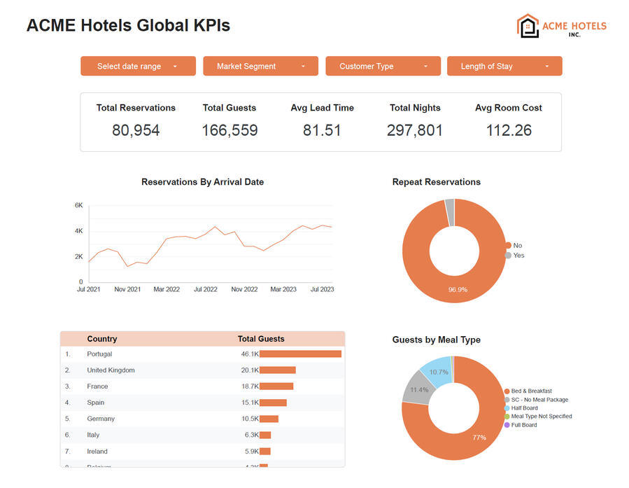 ACME Hotels requested to have automated reports updated with live data from the database. These reports need to be available online for all stakeholders. They also would like to have some interactivity added to the reports to help monitor performance and identify trends.A new database needs to be implemented with the fields requested in the project brief.The are 3 dashboards to be created: