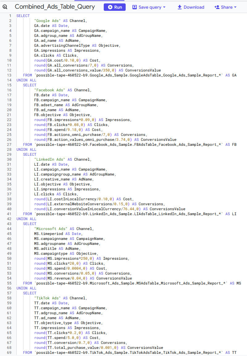 A UNION ALL SELECT statement was written in BigQuery to combine the different ad campaigns into one data source.